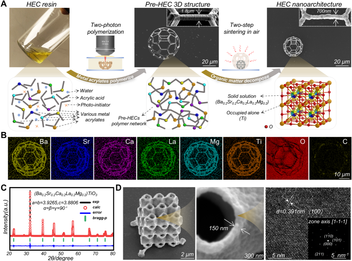 高熵陶瓷(HECs)通常是由四种及以上等摩尔或近等摩尔比的金属阳离子与非金属元素(如碳、氮、氧、硼)共同构成的新型多组元陶瓷材料。其核心特征在于利用显著的高熵效应稳定单一晶体结构,结合晶格畸变效应、缓慢扩散效应和鸡尾酒效应,能够突破传统陶瓷的性能限制,展现出优异的高温稳定性、抗氧化与耐腐蚀性、超高的硬度与断裂韧性,在热障涂层、核能材料、催化剂和耐磨部件等极端环境应用中潜力巨大。然而,目前高熵陶瓷的研究多集中于粉末、块体及涂层等形态,如何实现具有复杂三维形貌、尤其是百纳米级特征尺寸的高精度陶瓷结构,仍是制约其在微纳光子器件、微机电系统与高性能机械超材料等前沿领域应用的关键技术瓶颈。