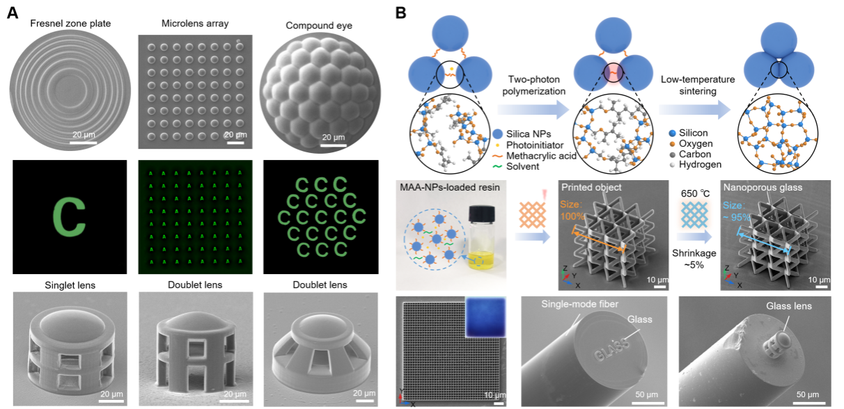 图3 玻璃微纳三维打印:(a)微光学器件,(b)低温制备低收缩率玻璃微结构