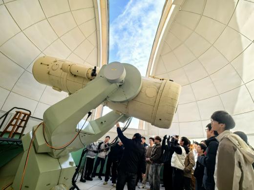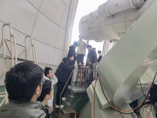 师生们首先参观了施密特望远镜。在望远镜圆顶内部,工作人员详细讲解了该设备的性能特点与科学使命。施密特望远镜具备大视场优势,可灵活开展多色测光,系统研究近邻星系及星系团的物理性质。为提升信噪比,观测时需使用液氮将CCD冷却至零下100摄氏度,以有效抑制热噪声。尽管白天无法进行实际观测,但通过工程师的细致讲解,同学们仍对设备的工作原理与科学价值形成了清晰认知。