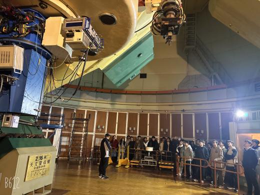 随后,师生们来到2.16米天文光学望远镜前。基地老师从天文光学望远镜系统原理、结构及关键技术进行了系统介绍。这台望远镜是我国自主研制的大口径精密光学望远镜,于1989年在此正式启用。其有效口径达2.16米,配备卡塞格林与折轴两套焦点系统,转换时间仅需一分钟,这一设计在当时具有国际领先水平。该望远镜搭载了BFOSC暗天体相机谱仪、卡塞格林低色散光谱仪、多通道高速光度计和折轴高色散光谱仪等一系列终端设备,可支持多种天体物理课题的观测研究。自建成以来,2.16米望远镜长期保持我国在远东地区天体观测的领先地位。