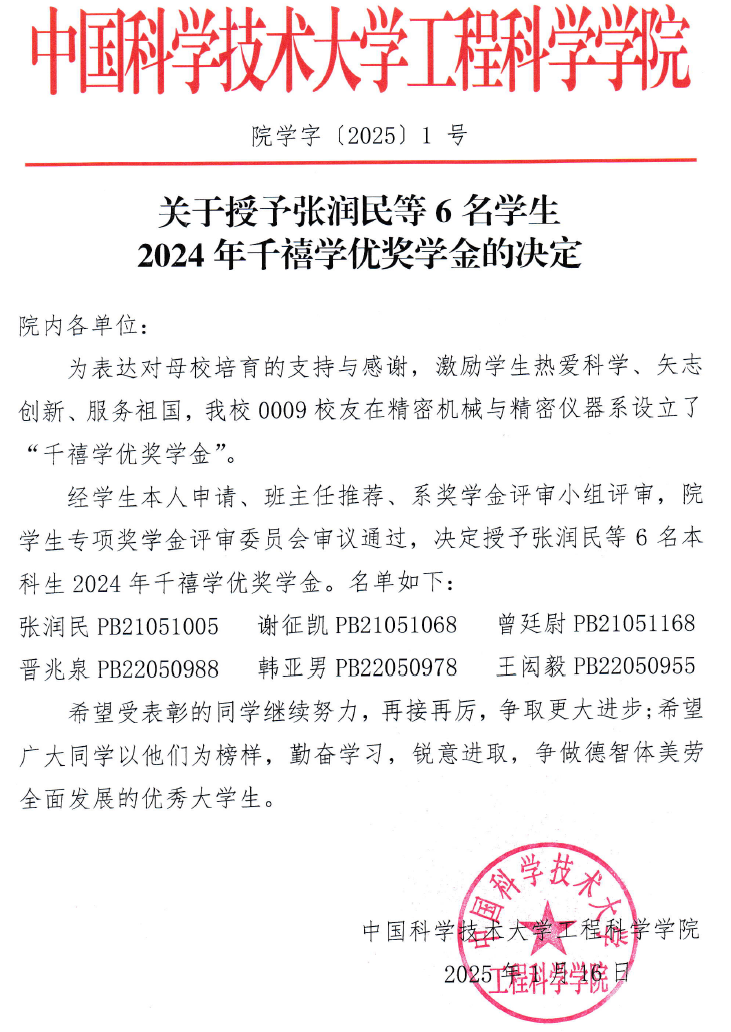 为了支持中国科学技术大学教育事业的发展,中国科大0009校友自2024年起,在中国科学技术大学工程科学学院设立“千禧学优奖学金”,用于鼓励在校勤奋学习、刻苦钻研、全面发展的精密机械与精密仪器系本科生。